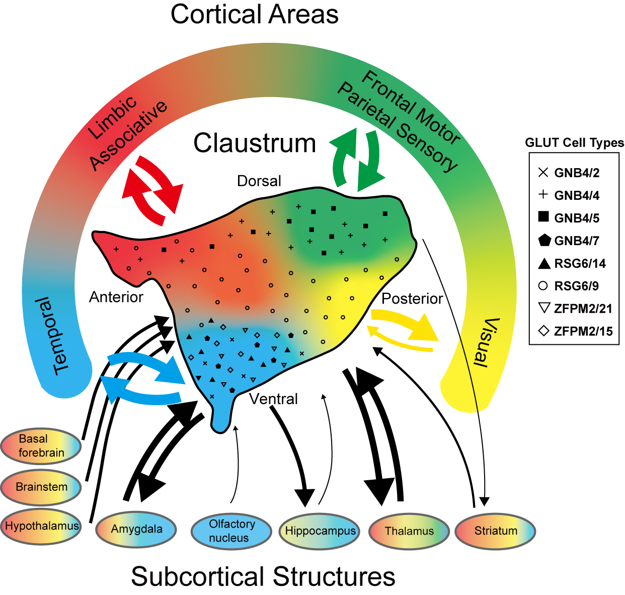 研究团队用逆向追踪技术绘制了猕猴屏状核全脑介观联接图谱,在猕猴皮层和皮层下74个脑区注射示踪剂,发现屏状核内部不同部位神经元的皮层投射存在明显的偏好性,据此可将屏状核分为四个亚区。进一步研究发现,屏状核与除小脑外所有皮层和皮层下脑区相连,是大脑中的连接中枢。有意思的是,研究团队发现猕猴屏状核内部存在广泛的前后轴联接,为屏状核单个神经元整合多模态信息提供了直接支持,而这被认为是意识产生的关键。