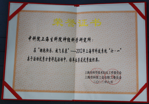 在由上海市科技妇委和工会联合组织了“拥抱快乐,放飞未来”——2012上海市科技系统“六·一”亲子活动优秀方案评选活动中,神经所妇委“春季采摘,科学育儿,增强情感,促和谐发展”获得最佳组织奖。