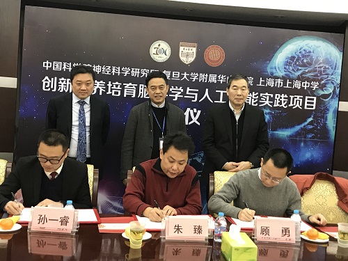 12月25日下午,中国科学院神经科学研究所,复旦大学附属华山医院与上海市上海中学共同举行“创新素养培育脑科学与人工智能实践项目”签约及揭牌仪式。中国科学院神经科学研究所蒲慕明所长、复旦大学附属华山医院毛颖副院长、上海中学冯志刚校长共同见证了项目签约并揭牌。
