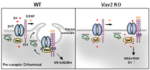 插图说明:生理情况下,GDNF促进Ret/DAT(多巴胺转运体)/Vav2蛋白复合物内吞,下调多巴胺转运体在质膜的表达和功能。在Vav2基因缺失情况下,多巴胺转运体在质膜的表达和功能异常增强,导致中脑边缘系统多巴胺水平的显著上升。