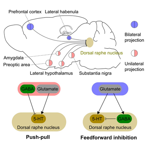 图注:上图,前额叶皮层(Prefrontal cortex)和外侧缰核(Lateral habenula)向背侧中缝核(Dorsal raphe nucleus)提供双侧的轴突投射(Bilateral projection),而下丘脑外侧区(Lateral hypothalamus)、视前区(Preoptic area)、黑质(Substantia nigra)和杏仁核(Amygdala)向背侧中缝核提供单侧轴突投射(Unilateral projection)。下图,功能性的长程投射调节5-羟色胺能神经元的两种主要模式:(左)推拉机制--同一脑区向单个5-羟色胺能神经元同时提供兴奋和抑制性输入,(右)前馈抑制--直接的兴奋性输入通过激活GABA能神经元提供间接的前馈抑制。