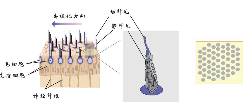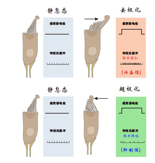 纤毛束的这种不对称排列使得毛细胞具有极性,静纤毛倒向动纤毛使得毛细胞发生去极化(即毛细胞内外的电位差变小),毛细胞释放的神经递质增加,前庭传入神经发放脉冲的频率增加(图6)。类似的,静纤毛倒离动纤毛将降低前庭传入神经发放脉冲的频率。发放频率改变的程度取决于纤毛束的偏折程度。因此,毛细胞可以将纤毛束的偏折方向和程度转化为前庭传入神经发放脉冲频率的改变。