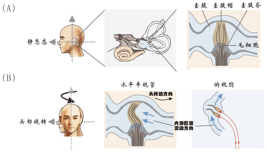 图8 半规管传导旋转加速度。( A )静息状态下,前庭器官(左)的水平半规管壶腹帽(右)的状态.( B )头部旋转时,水平半规管壶腹帽的状态.。(余雪菲 绘制,改编自Kandel, E. R., et al. ,2000)
