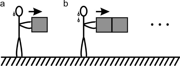 图1 推动物体的难度正比于物体的惯性,惯性的大小用质量表征。(a)推动一块积木可能需要消费一滴“汗”;(b)推动两块块积木可能需要消费两滴“汗”。飞船中的积木处于失重状态,船员通过魔术胶带使自己的双脚粘在飞船的底部。