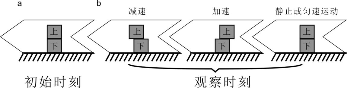 于是,柯克船长和史巴克找来两块积木,将它俩叠在一起,以保证这两块积木的初始运动状态是一样的(图2 a),其中“下”被粘在飞船底部,而“上”没有固定在飞船的任何部件,可以“随心所欲”依从自己的惯性。