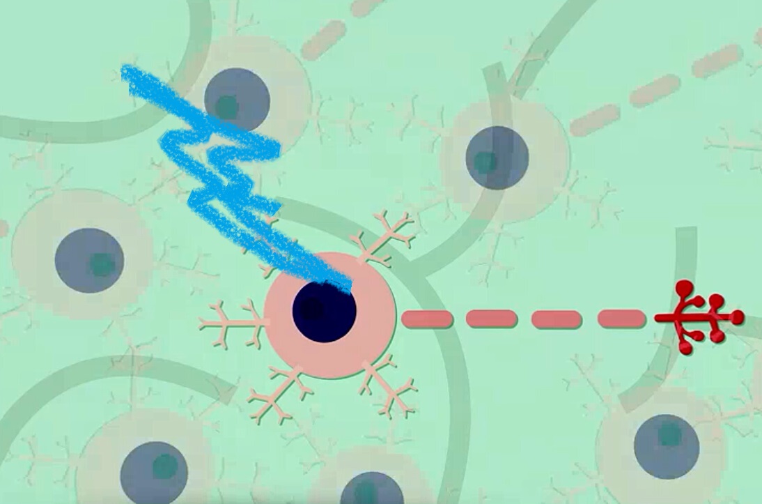 然后,我们打开蓝光,神经元上的光敏感通道被打开。当阳离子进入神经元,神经元就会兴奋,这种神经元负责的功能就会开启。光遗传学技术的一个优势就是,它能够让光敏感通道蛋白只表达在特定种类的神经元中,进而使得科研人员能够操控特定种类的神经元。