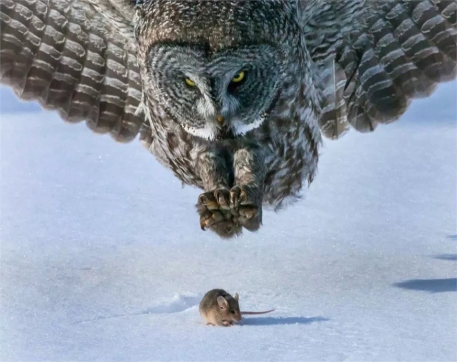 有一天,猫头鹰看到地上有老鼠,就悄悄地飞了下来。老鼠扭头一霎那间,就看到一个黑影向它扑来,这时的它像是被冰封了——本来举起的小胳膊也放不下了,翘起的尾巴还悬在空中。而此时的猫头鹰,突然失去了目标,随即调转方向,飞向了另外一个树干。