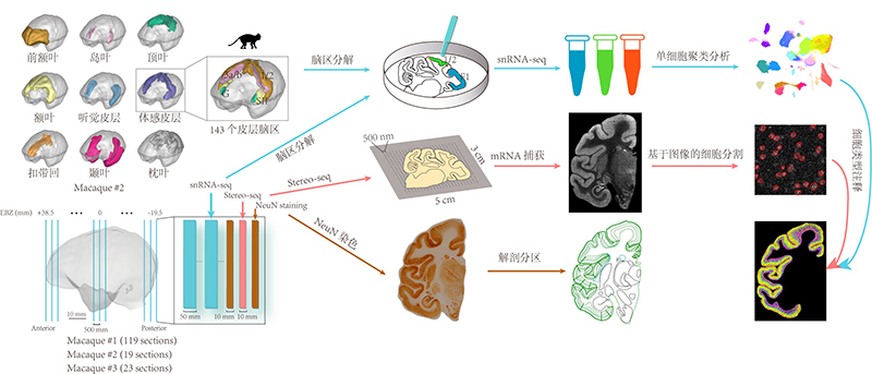 2023年7月12日23点, Cell期刊在线发表了题为“Single-cell spatial transcriptome reveals cell-type organization in macaque cortex”的研究论文,该研究成果由中国科学院脑科学与智能技术卓越创新中心(神经科学研究所)与华大生命科学研究院、临港实验室、上海脑科学与类脑研究中心、腾讯AI Lab、深圳国家基因库、瑞典皇家理工学院、卡罗林斯卡医学院等单位106人的科研团队合作完成。该研究利用我国自主研发的超高精度大视场空间转录组测序技术Stereo-seq和高通量单细胞核转录组测序技术DNBelab C4 snRNA-seq,成功绘制了猕猴大脑皮层的细胞类型分类树,并揭示了细胞类型组成和灵长类脑区层级结构之间的关系,为进一步研究各类神经元之间的连接提供了分子细胞基础。