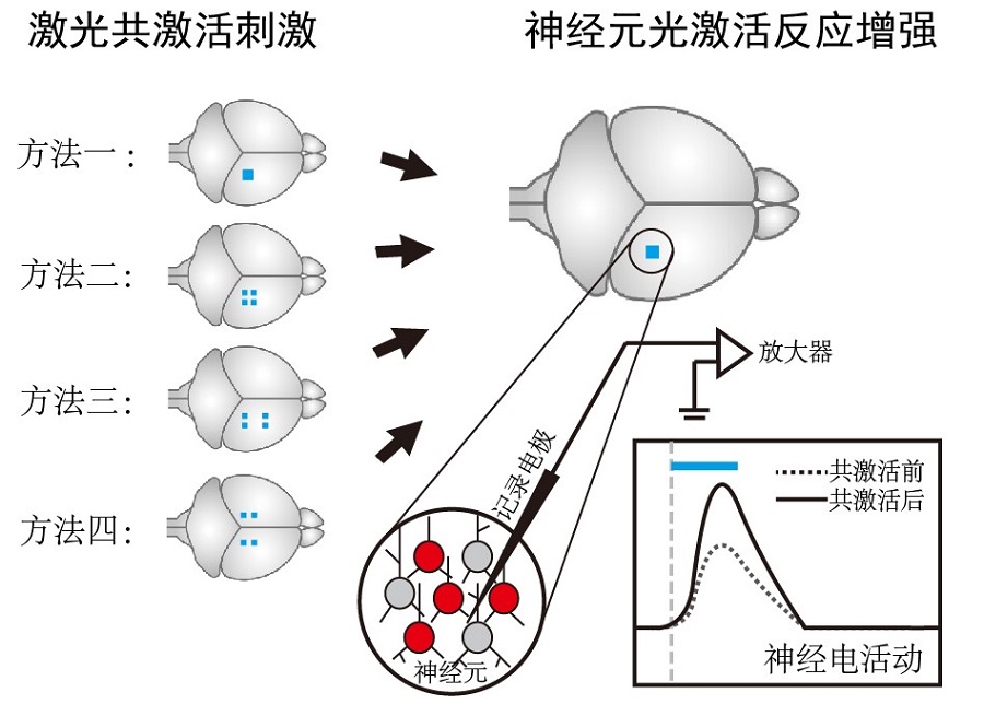 图注:左边,在小鼠大脑皮层表面给予的4种不同空间分布的激光共刺激。蓝色方块表示激光刺激光斑,4种共激活刺激使用的光斑总面积相同;右边,4种不同的激光共刺激后,得到的结果趋势相同。即共同刺激之后,测试刺激诱导产生的神经元反应增强。小鼠大脑上的蓝色方块为检测刺激光斑,下方放大的圆圈中为神经元与记录电极示意图。红色为表达光激活通道ChR2的神经元,右侧方框中显示了检测光斑引起的神经电活动在共刺激前(虚线)后(实线)的比较。灰色虚线为刺激起始时间,蓝色横线为刺激时长。