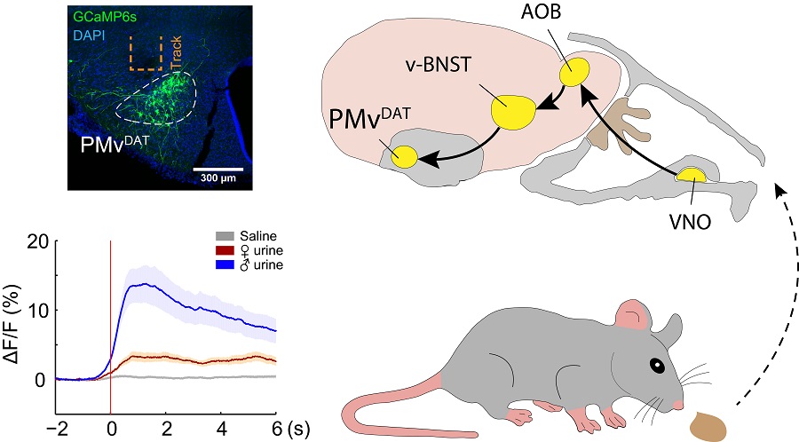 利用钙信号记录系统,许晓鸿研究组发现腹侧乳头体前核表达多巴胺转运体的神经细胞(PMvDAT)在小鼠嗅闻成年雄鼠尿液时强烈响应,而对于去势雄鼠、雌鼠、幼鼠以及大鼠的尿液则反应很小。当利用药理遗传学方法抑制PMvDAT神经细胞时,雄性小鼠失去对于雄鼠尿液的辨识能力,相应的,对于雄性入侵者的攻击行为也显著下降。而激活这群PMvDAT细胞则增加对雄性小鼠的攻击。进一步,研究组利用阳离子通道(Trpc2)基因敲除小鼠,破坏犁鼻器的嗅觉信号传递,发现在基因敲除的雄性小鼠中,PMvDAT细胞对于雄性小鼠尿液的反应显著降低,说明PMvDAT细胞整合来自犁鼻器的嗅觉信息。随后,利用病毒示踪,钙信号记录和药理遗传学方法,研究组发现并证实来自犁鼻器的雄性小鼠尿液信号通过腹侧终纹床核传递到PMvDAT细胞。以上结果表明PMvDAT细胞特异性地编码同类雄性信息,并进一步指导行为的发生。该研究解析了雄性动物相关信息传输至下丘脑并引起攻击行为的细胞和环路机制,为进一步研究性别特异性嗅觉信息处理、性别特异性行为的调控以及性别感知和意识的神经基础奠定了坚实的基础。