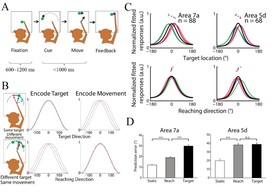 在实验中,团队成员对两只正在完成动态手动拦截的猕猴进行了在体细胞外电记录。记录的脑区包括了后顶叶皮层的7a区以及5d区。为了分析这两个脑区神经元对目标位置或手动方向的编码,研究者对细胞发放率的目标位置方向调谐曲线以及手动方向调谐曲线采用了高斯曲线拟合以提取出最优方向,并通过考察在不同目标运动速度下,调谐曲线的最优方向的方差来确定细胞对目标位置(或手动方向)调谐的不变性。为了进一步研究7a区以及5d区在细胞群体水平上对目标位置或手动方向的编码,研究人员采用了支持向量回归的机器学习方法。首先用动物对静止目标进行手动拦截时采集的细胞发放率数据对支持向量回归的模型进行训练,使得模型能通过细胞群体发放率模式来编码静止目标的位置(同时也是手动的方向),然后用训练好的模型对运动目标进行手动拦截时采集的群体发放率数据进行解码,再计算出解码得到的方向与实际的目标位置或者手动方向的误差,通过比较两种不同的误差的大小可以评估细胞群体更偏好于编码目标位置还是手动方向。