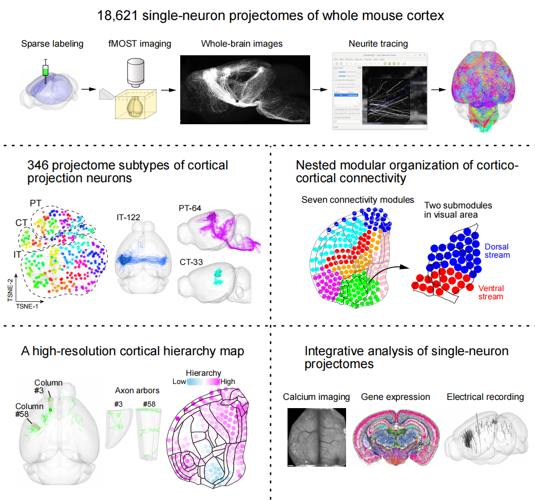 2026年1月7日,Neuron期刊以封面文章的形式发表了中国科学院脑科学与智能技术卓越创新中心(神经科学研究所)严军研究组的题为《Integrative analysis of single-neuron projectomes links connectome, transcriptome, and function in the mouse cortex》的研究论文。在本期Neuron杂志中,严军团队绘制了覆盖小鼠全皮层区域的单神经元轴突投射图谱,揭示了大脑连接组、转录组与功能之间的内在关联。
