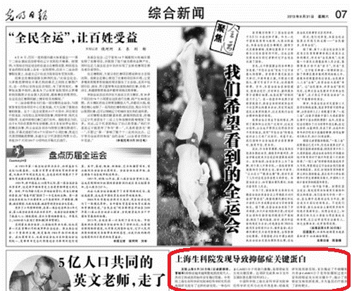 上海生科院发现导致抑郁症关键蛋白(光明日报)