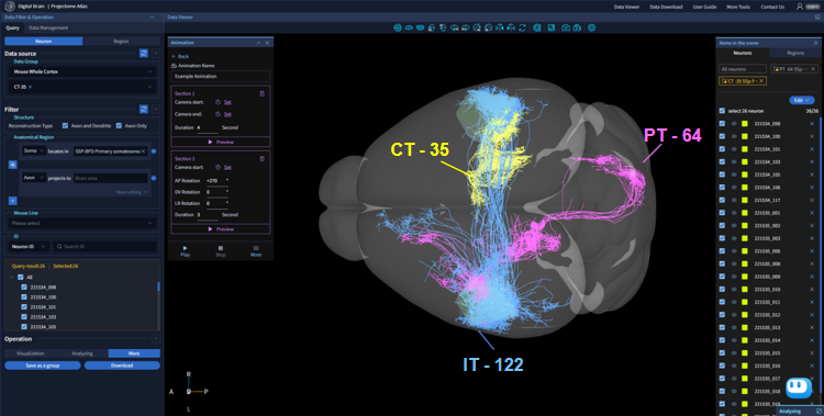 研究人员通过对全脑范围内神经元轴突形态进行系统聚类,定量刻画了单神经元轴突形态的相似性,获得了346个皮层神经元投射组亚型。平台支持用户通过浏览器灵活筛选并查看该数据集的神经元亚型。在可视化窗口中,用户可直观查看神经元形态、空间分布以及全脑投射情况,并可将感兴趣的神经元一键保存为自定义群组进行针对性分析与数据组分享,或选择多个亚型的神经元进行对比分析探索。研究人员能够直观地理解数据,为进行功能实验或后续深度分析提供线索。