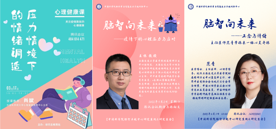 每年三四月份正值研究生转博考核、年度考核、毕业答辩、求职就业、新生定组并开启研究工作的关键期,突发的疫情又改变了既有的模式,连日居家隔离的烦闷、在线学习的压力以及对实验的渴望,心中难免涌起各种情绪风云。为此,从3月17日起,中心陆续邀请了国科大心理中心肖斌主任、上海交通大学医学院附属精神卫生中心副院长王振教授、康复科主任范青主任医师通过云端给学生们带来了《压力情境下的情绪调试》、《疫情下的心理压力与应对》、《正念与情绪互动训练》等,缓解大家的心理情绪,提高个人抗压能力,帮助同学们悦纳自我,积极向上,坦然面对疫情,积极调试心理。