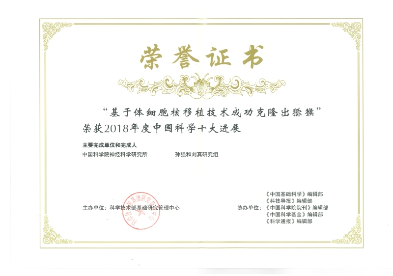 “基于体细胞核移植技术成功克隆出猕猴”荣获2018年度中国科学十大进展