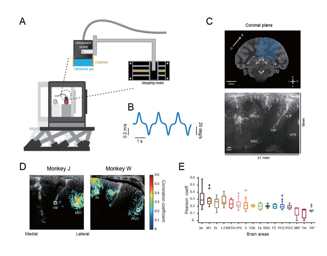图一:(A)实验装置和超声成像示意图。(B)自身运动速度曲线。(C)超声图像示例。(D)超声激活图谱(冠状面示例)。(E)被激活脑区的皮尔森相关系数分布。