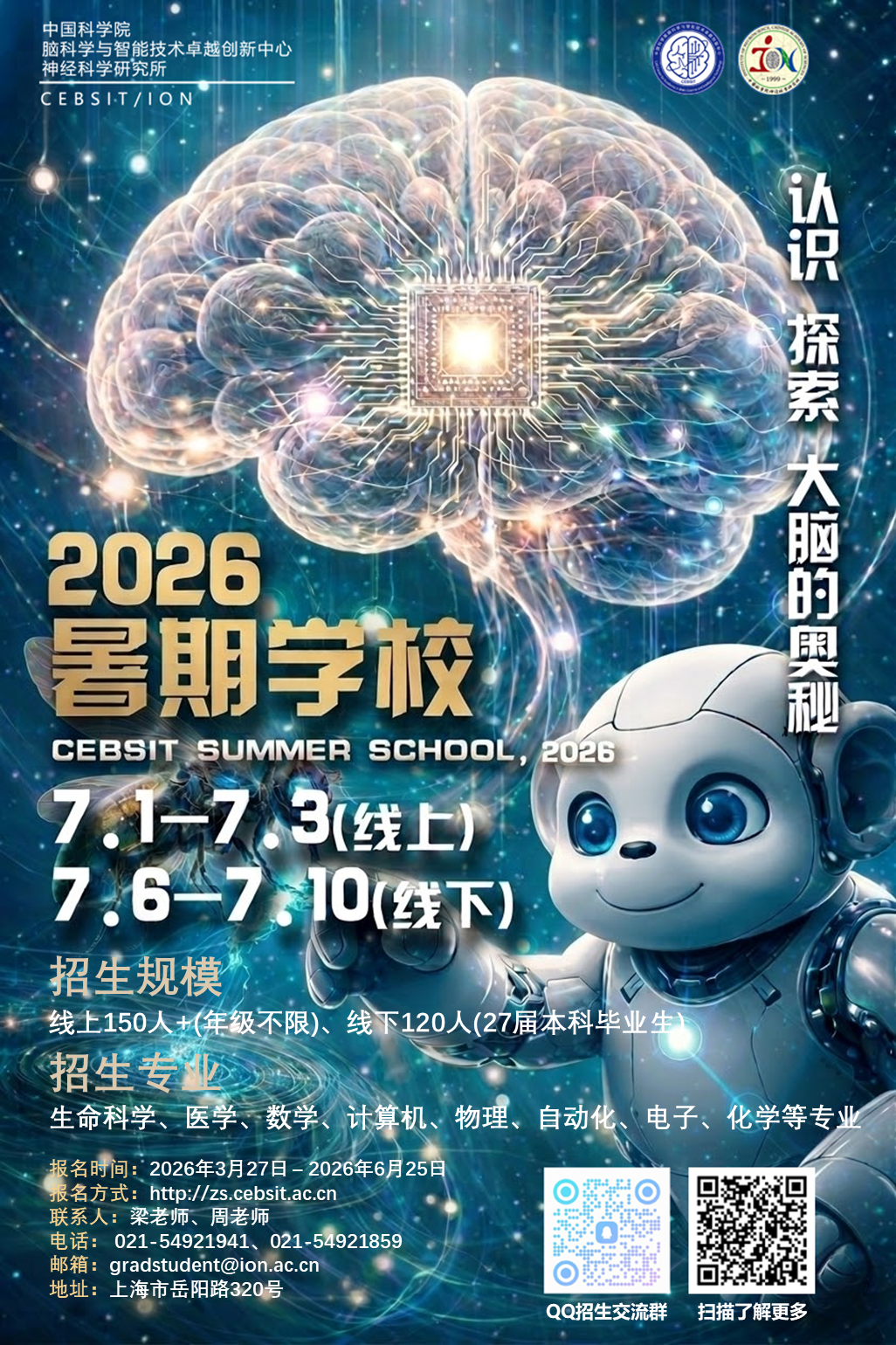 解析大脑的奥秘一直是人类的终极梦想。中国科学院脑科学与智能技术卓越创新中心暑期学校预计将于2026年7月1日 - 7月3日(线上),7月6日- 7月10日(线下)举行,招生面向大学本科生命科学、医学、数学、计算机、物理、自动化、电子、化学等专业的学生。本次活动旨在提高大学生对脑科学与智能技术的认识与兴趣,吸引优秀大学生加入探索大脑奥秘的行列,并鼓励有志者报考脑智卓越中心攻读研究生。
